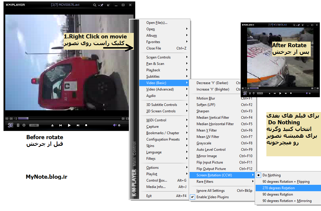 برخی مواقع پیش می آد که فیلمی رو که گرفتید (مخصوصا با موبایل)، فیلم 90 درجه چرخش نیاز داره تا خوب دیده بشه برای این منظور بهترن نرم افزار همون Kmplayer هست که هم هر نوع فایل تصویری رو نشون میده هم می تونید فیلم رو بچرخونید