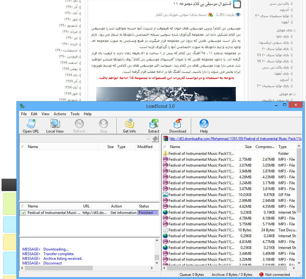 در زیر تصویری از محیط برنامه را می بینید که فایل ۱۰۴ مگابایتی فستیوال موسیقی بی کلام مجموعه ۱۱ را بدون اینکه بطور کامل دانلود کنم باز کردم و هر کدام را که بخواهم می توانم دانلود کنم.